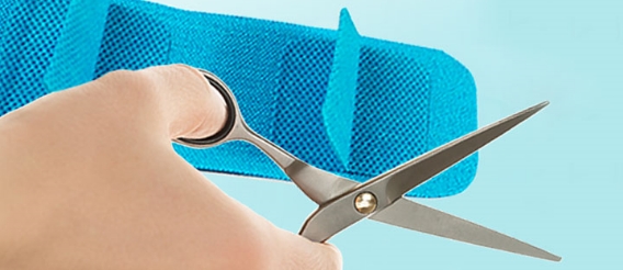部位と必要なタブの数に応じてテープをカットします。肩の場合2~3つ、肘・膝の場合3つ、腰背部の場合5~6つがタブの数の目安です。次にテープの角を丸くカットします。衣服などへの引っ掛かりを防ぎ、はがれにくくなります。